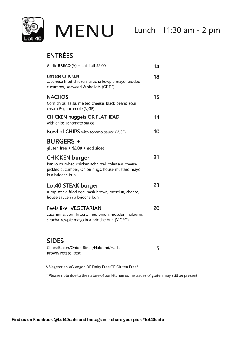 LOT 40 shines with its diverse menu, offering everything from enticing Entrées like the mouth-watering Garlic Bread and Karaage Chicken to hearty mains such as the iconic Steak Sandwich and decadent Lamb Shank. Each dish is crafted with care, ensuring that every bite is a delightful experience. For those who prefer something lighter, the Grilled Salmon is a fresh, flavorful choice that showcases the cafe's commitment to quality ingredients. And let’s not forget the delectable Kids' Menu, where little ones can delight in a sweet Sundae that’s sure to bring smiles all around.
